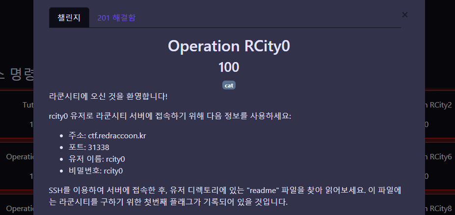 ssh rcity0@ctf.redraccoon.kr -p 31338
