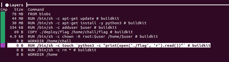 flag 파일 copy 되어 잘 들어감 -> python을 통해서 flag 파일을 읽고 print한 layer가 보인다 -> 하지만 뒤에 rm * 로 flag를 지워버렸다