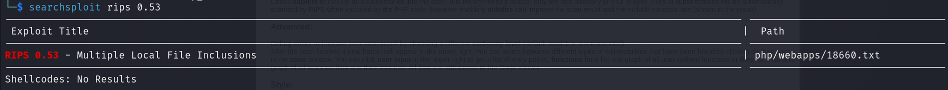 여러 파일들이 발견되었는데 디렉터리에 있는 정보도 좋지만 우선 RIPS 0.53 버전이라는 것을 아니깐 searchsploit 툴을 이용하여 공개 취약점을 검색합니다