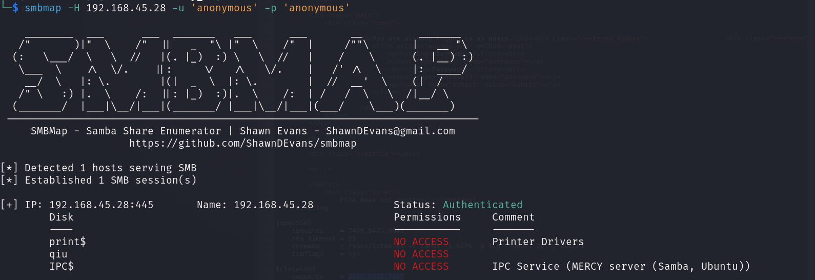 smbmap을 이용하여 null 세션 및 anonymous 세션 확인