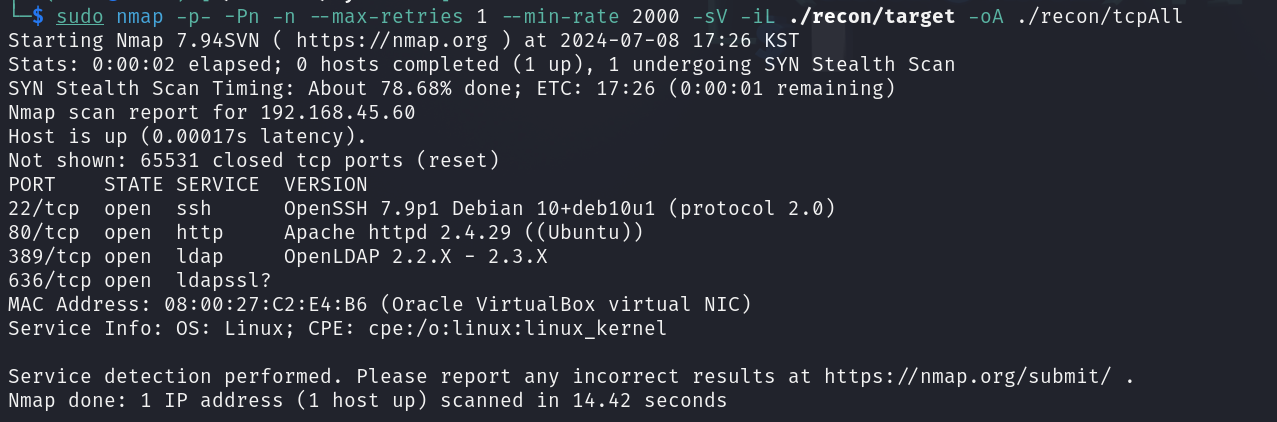 주석 처리된 ldap의 정보가 보이는 것을 확인할 수 있습니다. 이를 이용해서 대상 호스트로 초기 침투 해보겠습니다