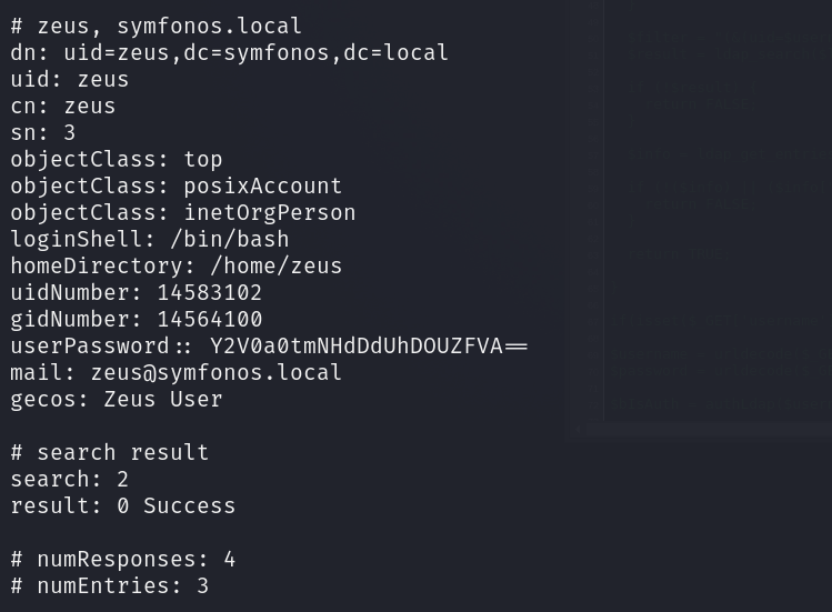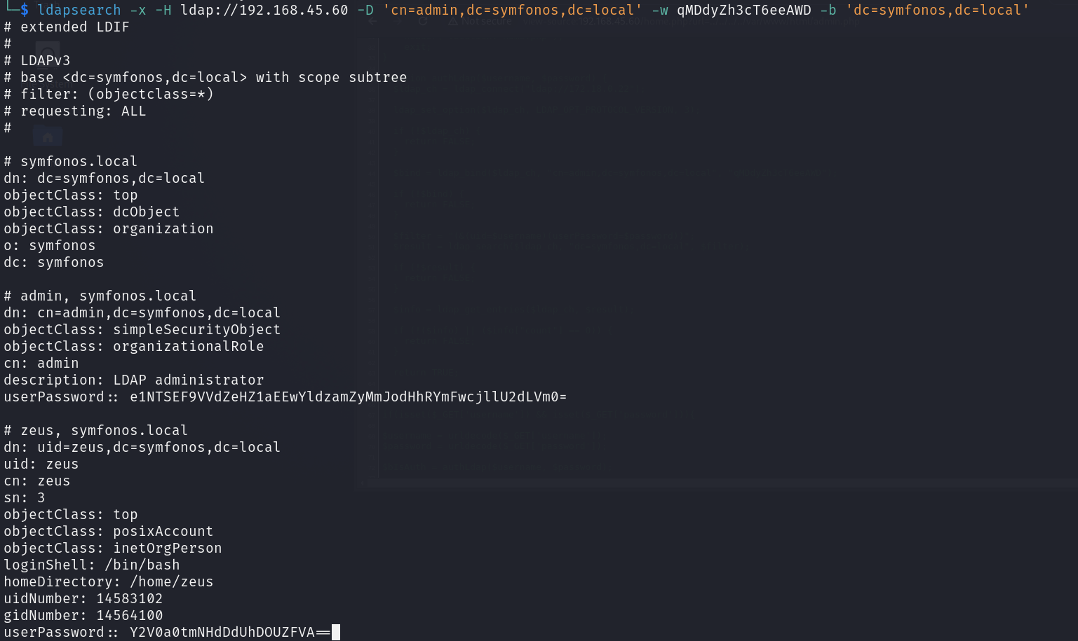 ldapsearch -x -H ldap://192.168.45.60 -D 'cn=admin,dc=symfonos,dc=local' -w qMDdyZh3cT6eeAWD -b 'dc=symfonos,dc=local'