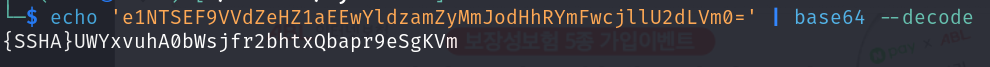 admin에 대한 userPassword가 있는데요 base64로 인코딩된거같습니다. 디코딩 후에 나온 값이 뭔지 검색해보니 openladp에서 비밀번호를 암호화하는 알고리즘을 이용해서 암호화된 비밀번호입니다!