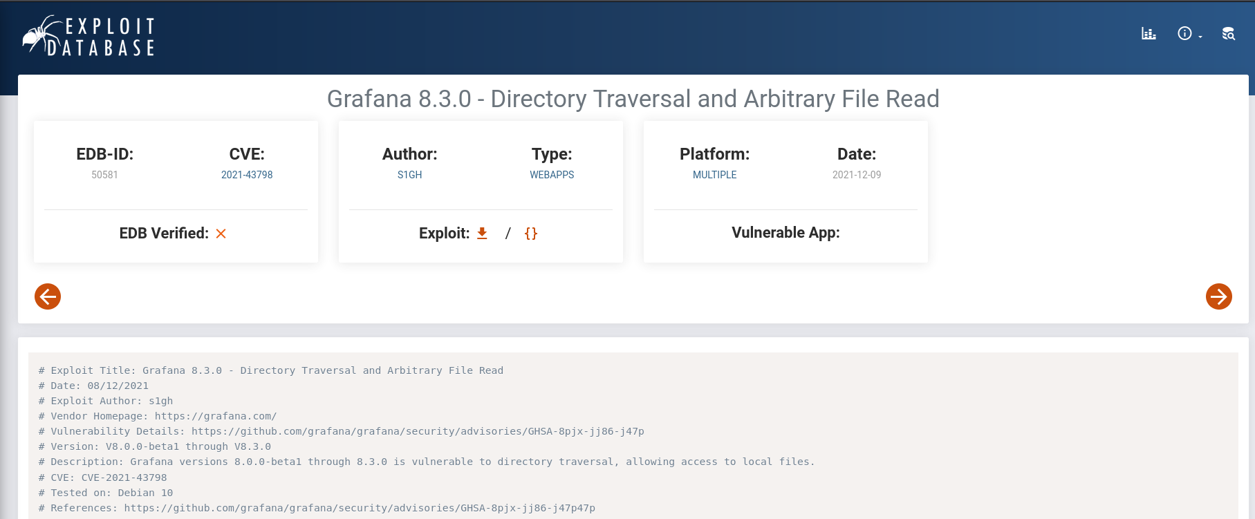 # Description: Grafana versions 8.0.0-beta1 through 8.3.0 is vulnerable to directory traversal, allowing access to local files.