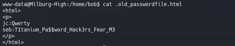 www-data@Milburg-High:/home/bob/Documents$ ls