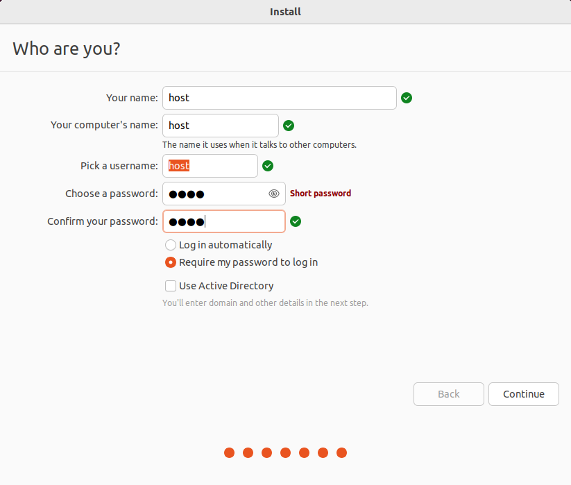 하고싶은 이름으로 정해서 continue 해줍니다 기다려주면 우분투가 재부팅 한다는 창을 눌러주면 재부팅이 됩니다!