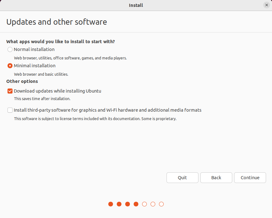 그리고 Minimal installation 으로 설정하고 Continue 해줍니다. 기본적인 것만 있으면 되니깐요!