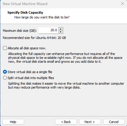하드디스크 설정은 20GB에 싱글 디스크로 설정해줍니다