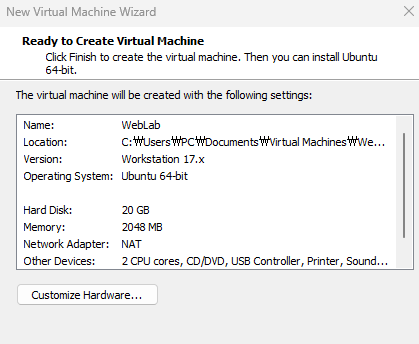 마지막 확인 창에서 Customize Hardware를 눌러 이제 이미지 파일을 넣어줍니다